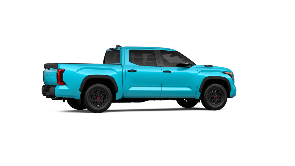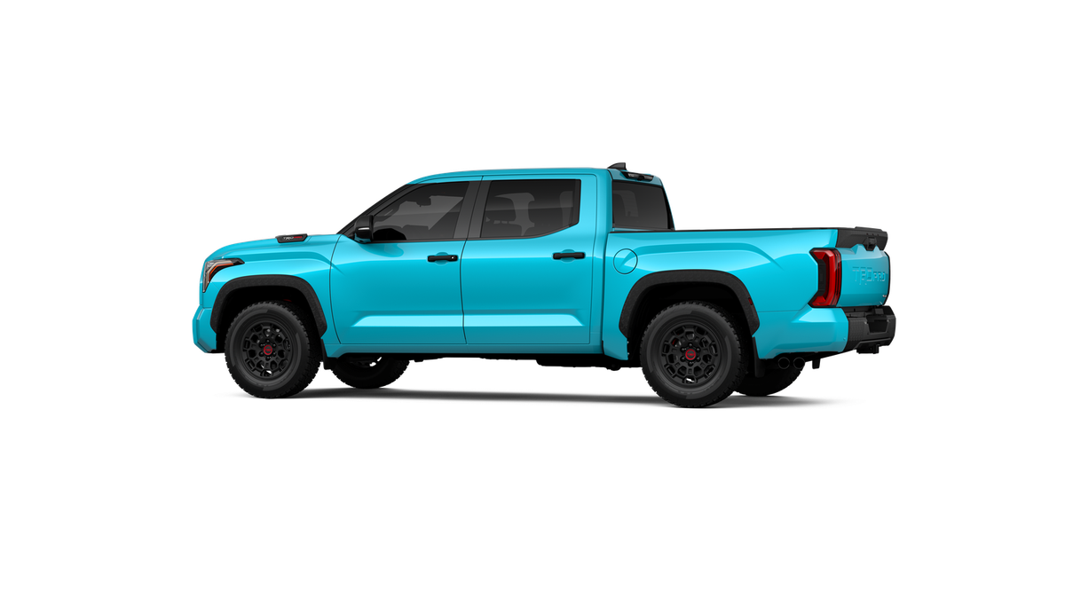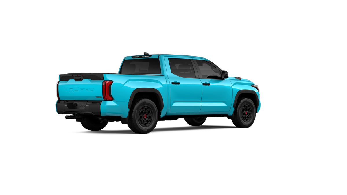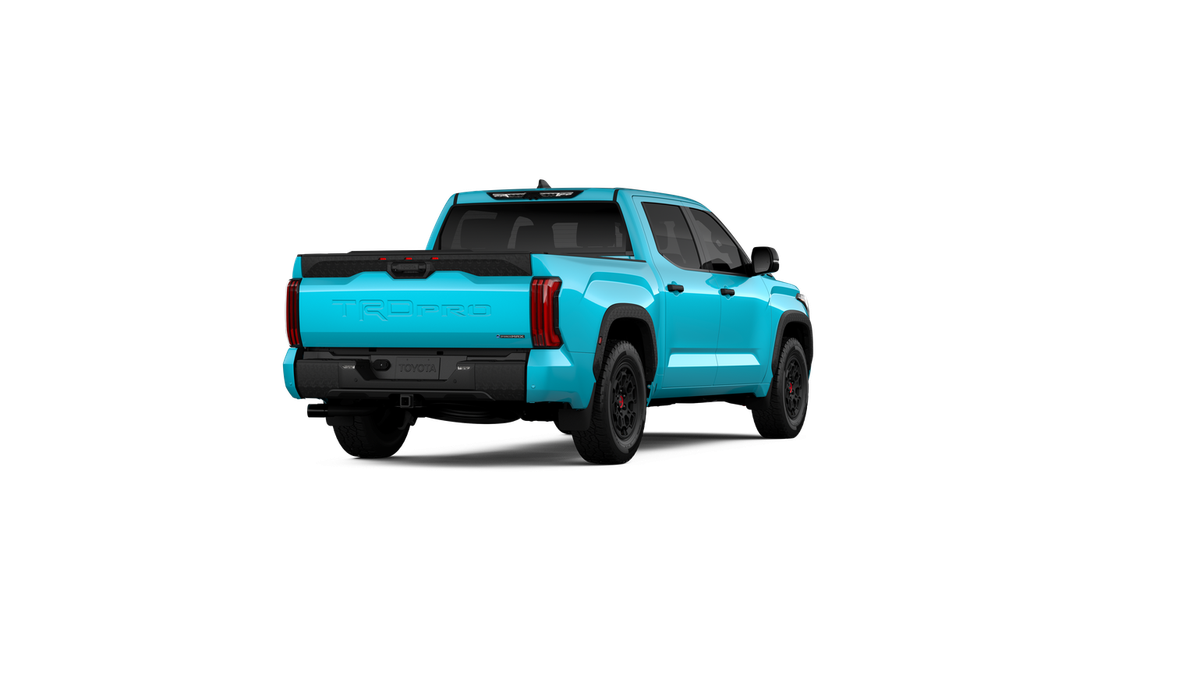 - "TRD PRO" hood badge; black door handles; black window molding and mirror caps; black technical-camo-grained tailgate spoiler and overfenders with marker lights